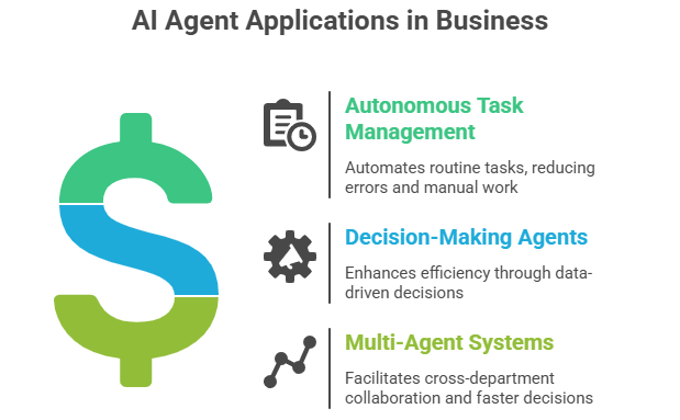 Figure 1: Infographic on AI agents for business highlighting enterprise AI agent solutions: autonomous task management, decision-making agents, and multi-agent systems.