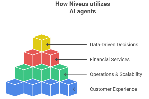 Figure 3: Infographics showing how Niveus utilizes AI agents: Customer Experience, Operations & Scalability, Financial Services, Data-Driven Decisions