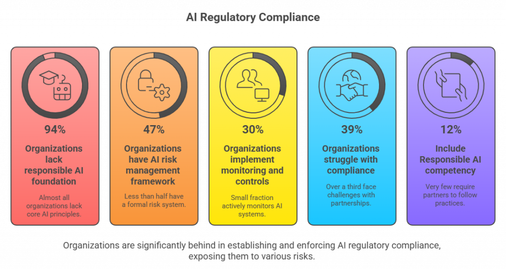- 39% struggle with compliance due to partnerships. Over a third of organizations face challenges ensuring AI compliance when working with third-party vendors or partners, highlighting that responsibility doesn’t end within the organization; it extends across collaborations.