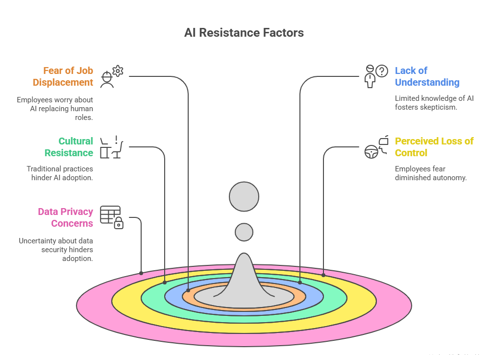 - Cultural Resistance: An organizational culture that favors traditional practices can be a significant barrier. Long-standing workflows and reluctance to change make it challenging to introduce AI effectively.