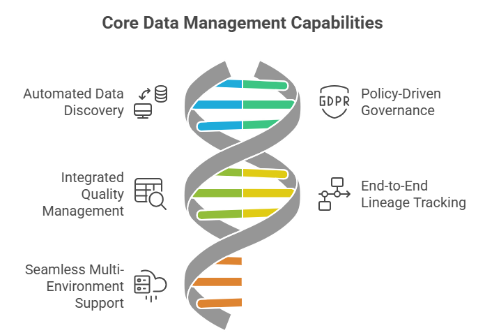 - Integrated Quality Management: Continuously profiles data to detect anomalies and raise data quality thresholds, from ~40% to ~80%, improving the accuracy of analytics and AI models.